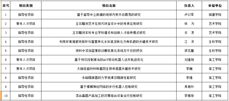我校在湖北省教育厅2018年度科研计划项目申请集中申报期间共收到有效申报项目34个,按照省教育厅的要求评选出了10个符合条件的项目,项目列表如下: