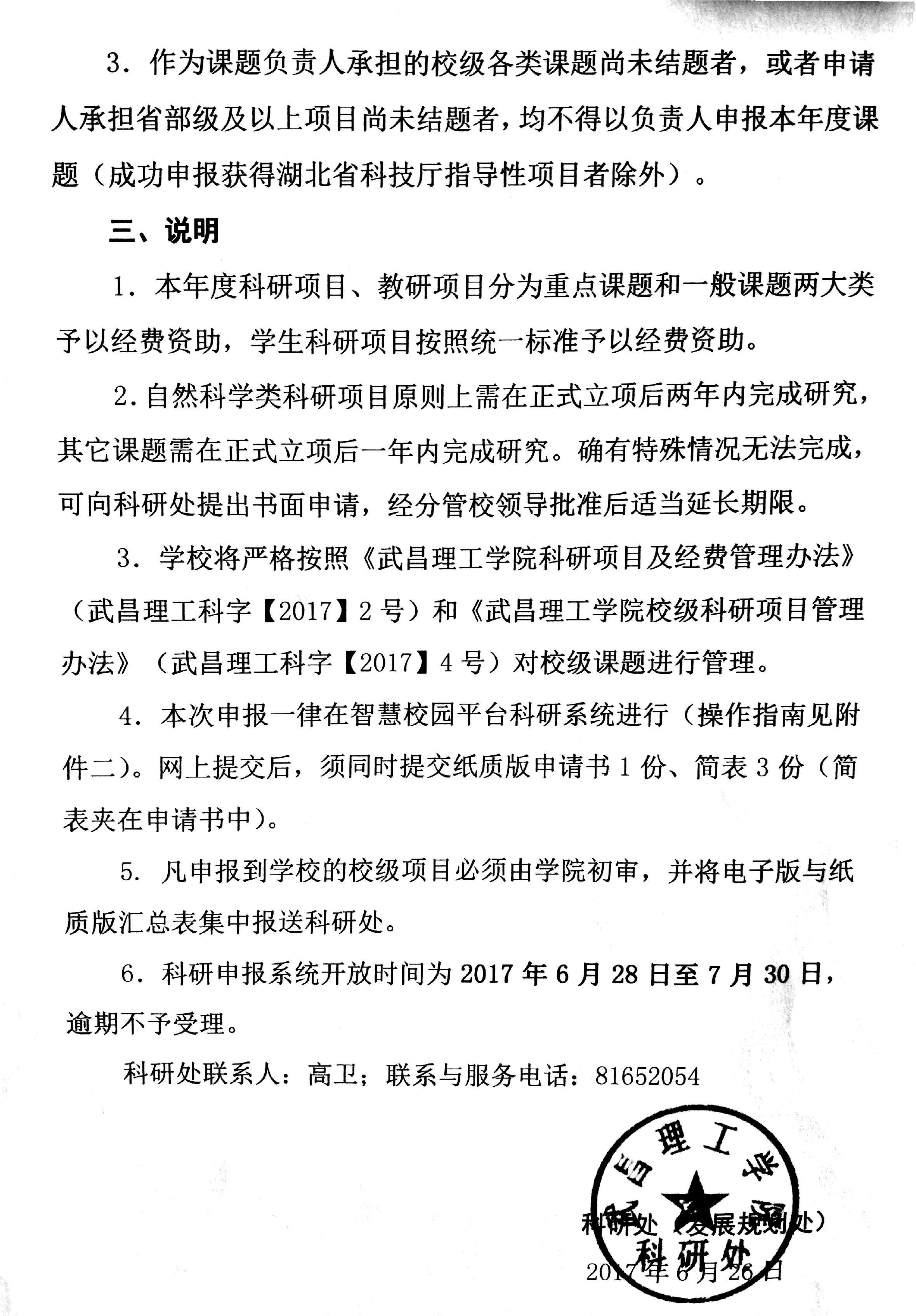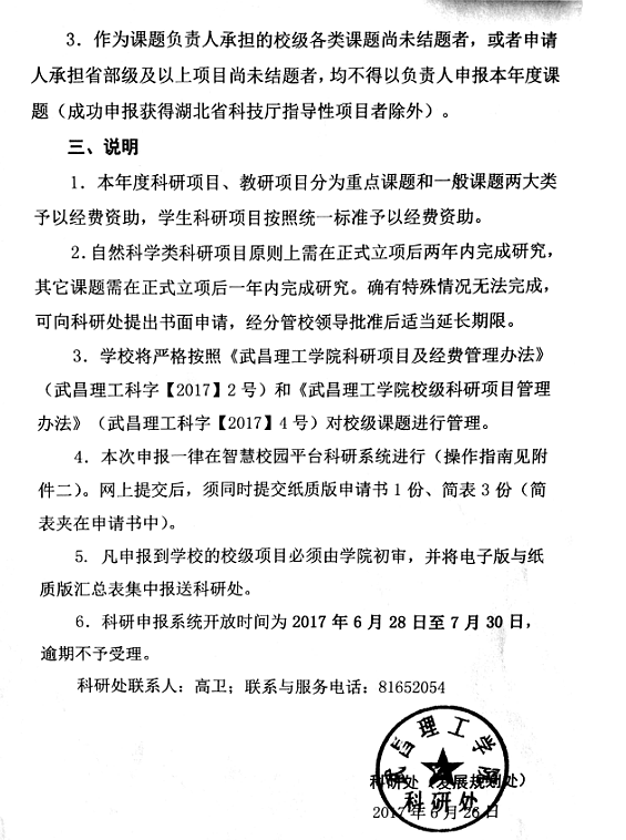 6.科研申报系统开放时间为2017年6月28日至7月30日,逾期不予受理。