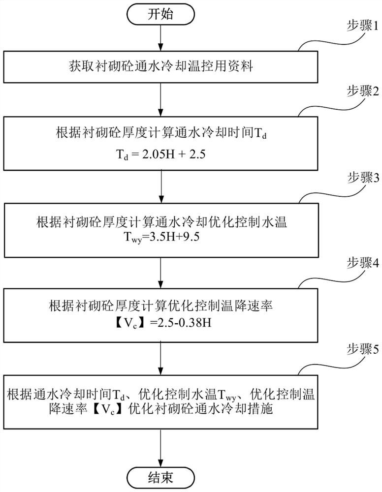 本发明提供不同厚度衬砌砼通水冷却优化控制方法,可客观准确地得到适用于不同厚度衬砌砼的优化控制通水冷却时间、水温、温降速率,并基于此对衬砌结构进行通水冷却,科学合理地实现温控防裂。通水冷却控温方法包括:步骤1.获取衬砌砼通水冷却温控用资料;步骤2.根据衬砌砼厚度计算通水冷却时间Td=2.05H+2.5;步骤3.根据衬砌砼厚度计算通水冷却优化控制水温Twy=3.5H+9.5;步骤4.根据衬砌砼厚度计算优化控制温降速率【Vc】=2.5‑0.38H;步骤5.根据通水冷却时间Td、优化控制水温Twy、优化控制温降速率【Vc】优化衬砌砼通水冷却措施。 |