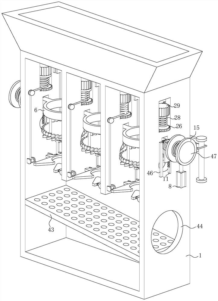 本发明公开了危险废弃物处理的一种环保型危险废弃物降解处理设备和方法,包括处理箱,所述处理箱左右侧壁上均开设有第一滑槽,所述第一滑槽由竖槽和转槽组成,所述竖槽的底端与转槽的顶端连通,所述竖槽内均滑动连接有第一滑块,所述第一滑块能够在转槽内转动,两个所述第一滑块共同滑动连接有位于处理箱内部的承载框,所述承载框的下方设置有两个关于承载框对称设置的夹板,所述夹板均与处理箱转动连接,所述处理箱的前侧固定连接有挡板,所述处理箱的内壁上固定连接有漏板,所述漏板位于承载框的下方;所述承载框的侧边设置有驱动组件,所述夹板的侧边设置有限位取消组件,本发明可以自动对农药瓶中的残余的农药进行收集。 |