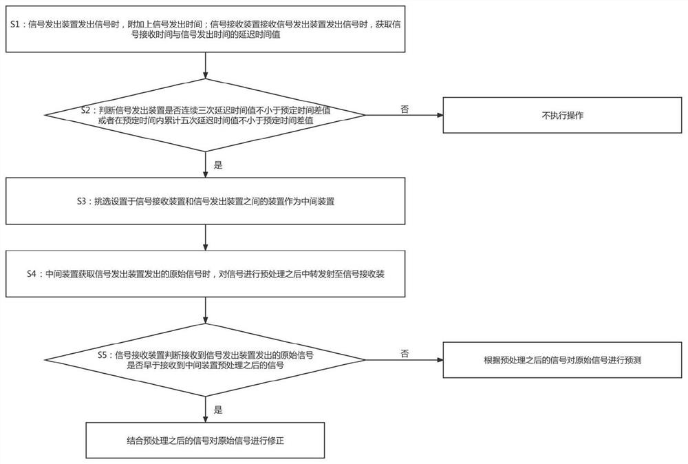 本发明提供一种基于跳转处理的延迟信号处理方法,涉及远程探测技术领域,包括以下步骤:获取信号发出装置的延迟时间值;判断信号发出装置是否频繁出现延迟时间值不小于预定时间差值,若是则挑选设置于信号接收装置和信号发出装置之间的装置作为中间装置;中间装置对原始信号进行预处理之后中转发射至信号接收装置;信号接收装置判断原始信号是否早于预处理信号到达;若是则结合预处理之后的信号对原始信号进行修正;反之则根据预处理之后的信号对原始信号进行预测。本发明简单合理,通过中间装置跳转式转达原始信号,可以对可能有信号延迟的原始信号进行预处理,从而降低信号延迟带来的损失,适用范围广。