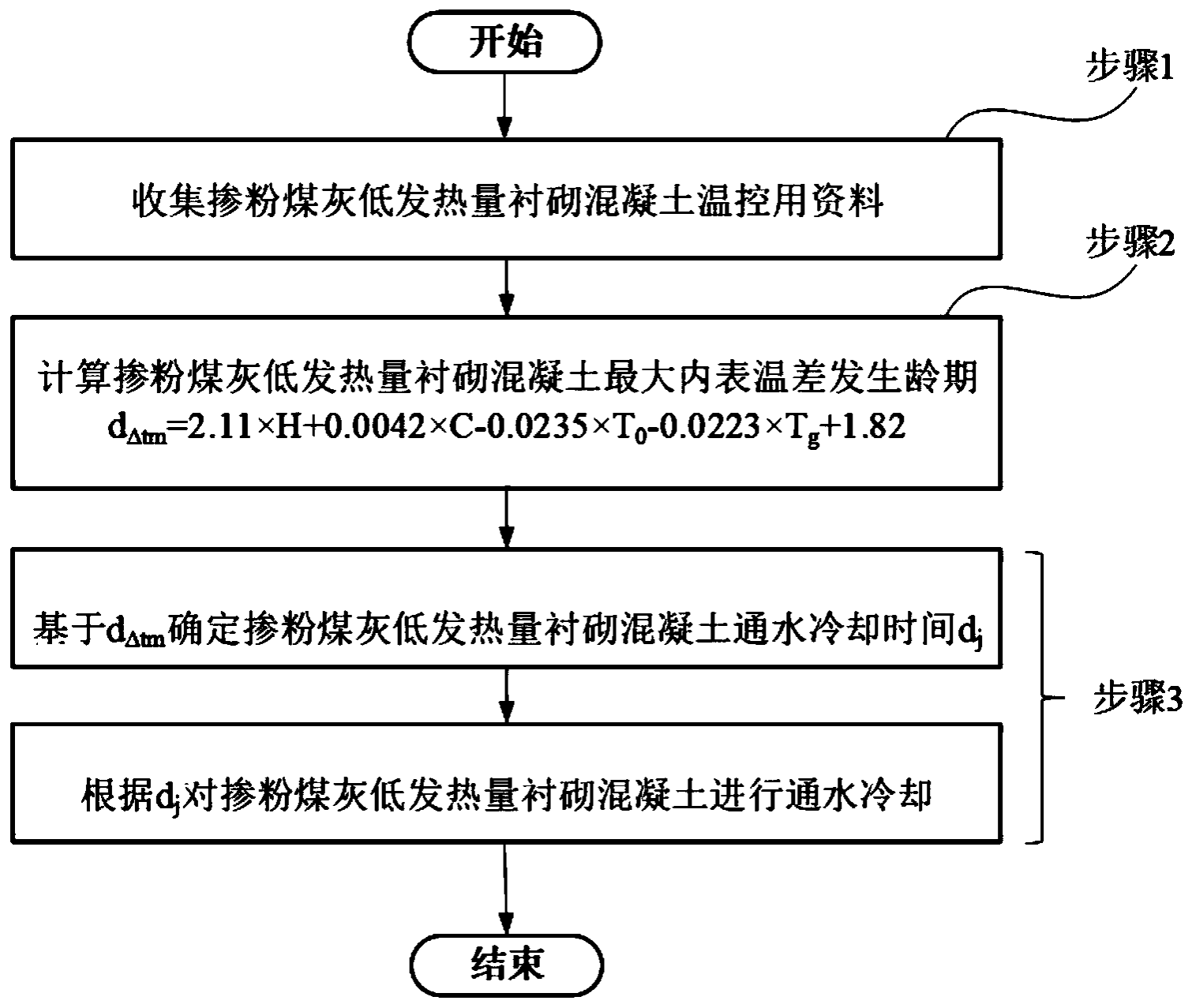 本发明提供一种掺粉煤灰低发热量衬砌混凝土通水冷却龄期控制方法,其特征在于包括:步骤1.收集掺粉煤灰低发热量衬砌混凝土温控用资料;步骤2.计算掺粉煤灰低发热量衬砌混凝土最大内表温差发生龄期dΔtm=2.11×H+0.0042×C‑0.0235×T0‑0.0223×Tg+1.82,步骤3.基于dΔtm确定掺粉煤灰低发热量衬砌混凝土通水冷却时间dj,然后根据dj对掺粉煤灰低发热量衬砌混凝土进行通水冷却,实现温控防裂。本方法科学性强,掺粉煤灰低发热量衬砌混凝土最大内表温差发生龄期计算公式,综合反映了衬砌混凝土结构厚度、强度等级、浇筑温度以及通水冷却及其水温等重要参数的影响,计算结果科学准确、精度高。