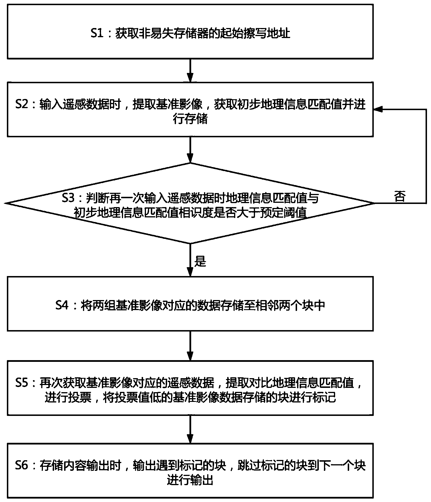 本发明提供一种基于非易失存储器的遥感数据快存方法,涉及数据存储技术领域,该方法包括以下步骤:S1:获取非易失存储器的起始擦写地址;S2:输入遥感数据时,提取基准影像获取初步地理信息匹配值;S3:判断再一次输入的地理信息匹配值与初步地理信息匹配值相识度是否大于预定阈值,若是则执行步骤S4,反之则执行步骤S2;S4:将两组基准影像对应的数据存储至相邻两个块中;S5:再次获取对比遥感数据,进行投票,投票值低的块进行标记;S6:存储内容输出时,输出遇到标记的块,跳过标记的块到下一个块进行输出。本发明一种基于非易失存储器的遥感数据快存方法数据存储快速,准确性高,误差小,可以进行数据对比修正,存储数据方便查询。