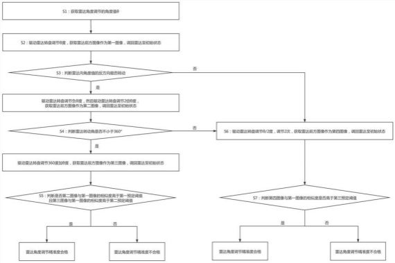 本发明提供一种雷达角度精确调节的调试方法,涉及测绘测量技术领域,包括:S1:获取调节角度值θ;S2:调节θ度,获取第一图像;S3:判断雷达能否反向转动,能则调节负θ度,然后调节2倍θ度,获取第二图像;S4:判断能否360°转动,能则调节360度加θ度,获取第三图像;S5:判断是否第二与第一图像相似度高且第三与第一图像相似度高,是则精准度合格,反之不合格;S6:驱动调节θ/2度两次,获取第四图像;S7:判断是否第四与第一图像相似度高,是则精准度合格;反之不合格。本发明使用便捷,无需对雷达和转盘进行拆卸,可以对雷达角度调节的精确度进行调试和检测,保证雷达精确度和安全性,无需人工校准,可靠性更高。
